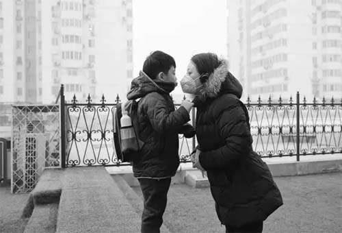 雾霾红色预警结束,各中小学恢复上课,当天北京AQI指数305,仍属严重污染。这天早上,一位母亲和孩子在幼儿园门口分别。