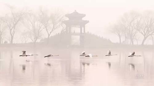 清晨,一队中途休息的天鹅在雾霾中飞过昆明湖