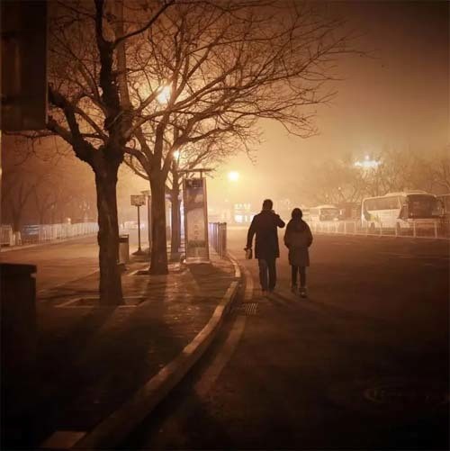 平安夜午夜时分,一对错过了末班车的情侣在雾霾中焦急地等待出租车......