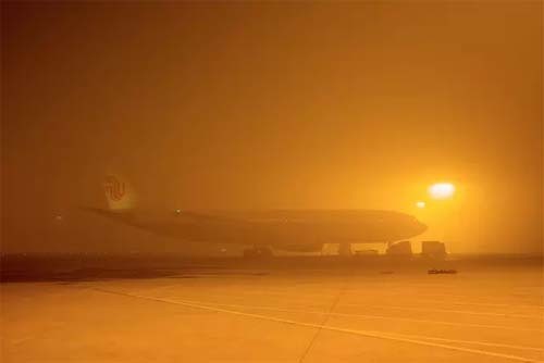 停机坪里的飞机笼罩在昏黄的迷雾中