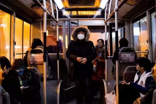 晚上7点,北京市325路公交车上,在路灯的映衬下,车窗外一片土黄色。