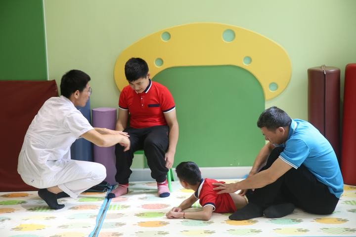 第一站是康复训练区。走进2号楼一楼康复室,3名康复师正在进行一对一教学。15岁的宋宋正在康复师的指导下练习走路。从坐姿到站立,普通人仅花费几秒的动作,宋宋却需要拆分成好几个步骤完成。