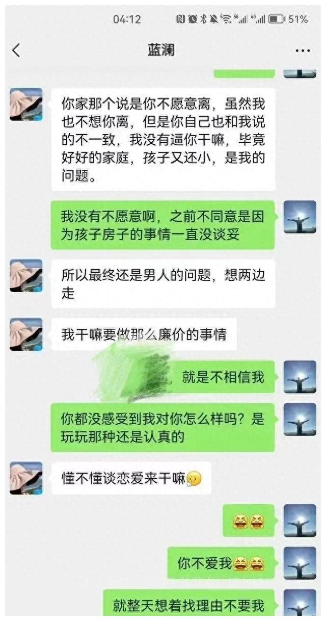 经理在聊天中明确提到离婚这个话题时,局长避而不谈,暗示他们不应再讨论这个问题。这种回避态度显示,局长可能不打算认真履行离婚承诺,他更愿意将这个关系长期维持为一段情感外遇。