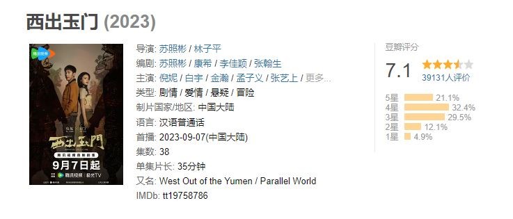 《西出玉门》在豆瓣的评分为7.1分,算是一个不错的评分。只不过现在《西出玉门》大结局还属于点映状态,相信更多人看完大结局后,这个评分还会掉。你们说呢?