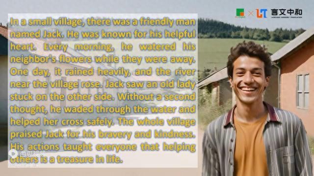 In a small village,there was a friendly man named Jack,He was known for his helpful heart every morning.He watered his neighbor's flowers.while they were away one day.It rained heavily and the river near the village rose.Jack saw an old lady stuck on the other side.Without a second thought he waited through the water and helped her cross safely.