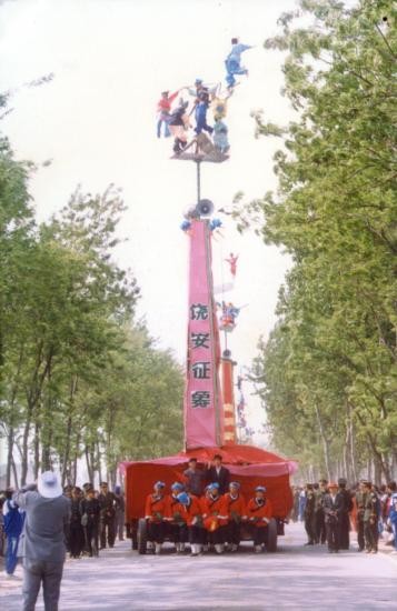 支撑童男童女表演舞台的木杆下端,固定在由铁、木制做的架子上,架子上放着许多石磨盘、石块,架子由36名粗壮的大汉抬着,踏着鼓点游行演出。表演时,人山人海,喧声震天,数万人涌满大街小巷。