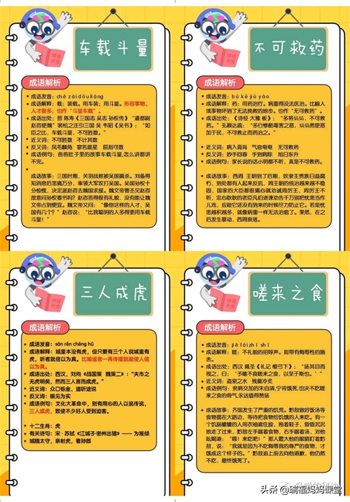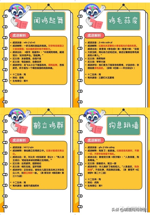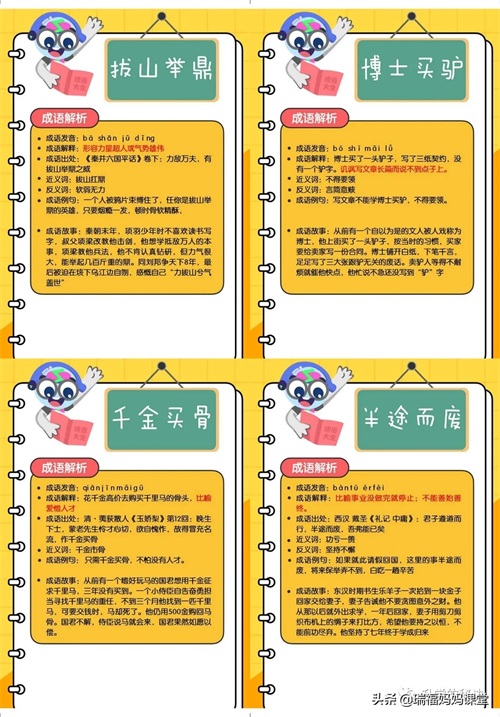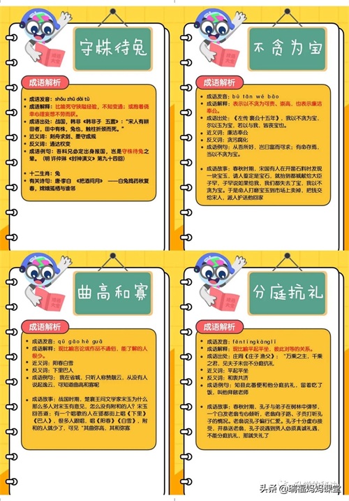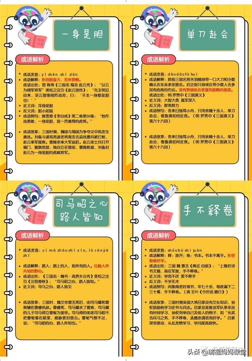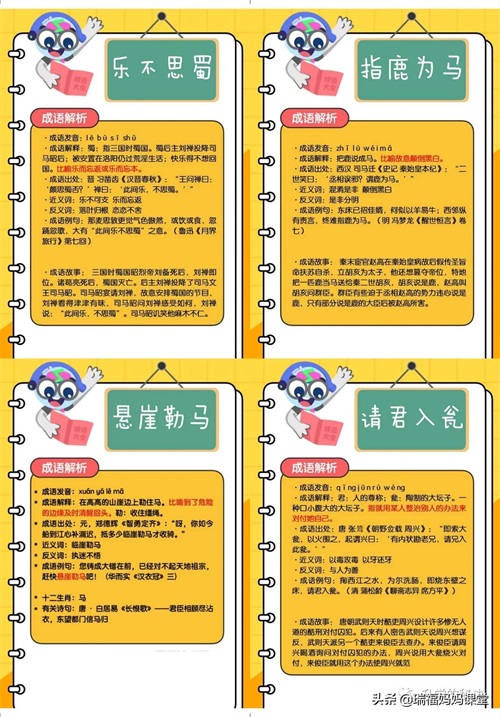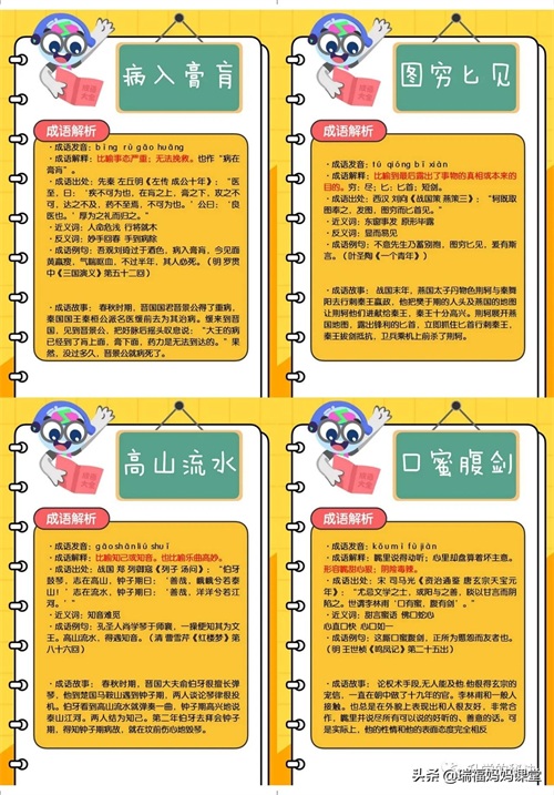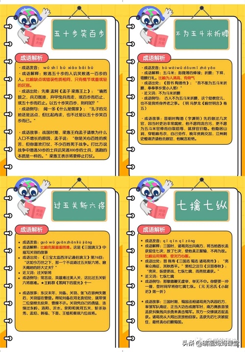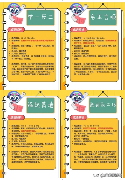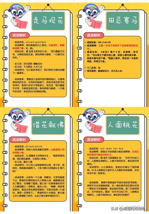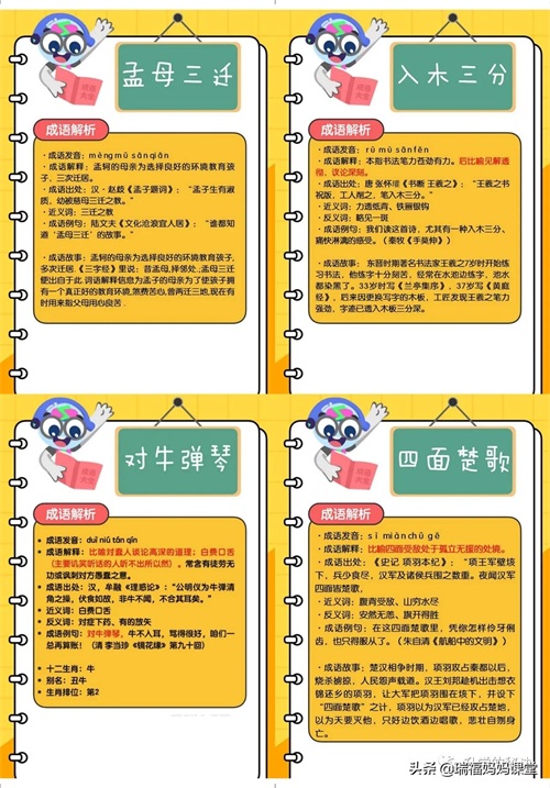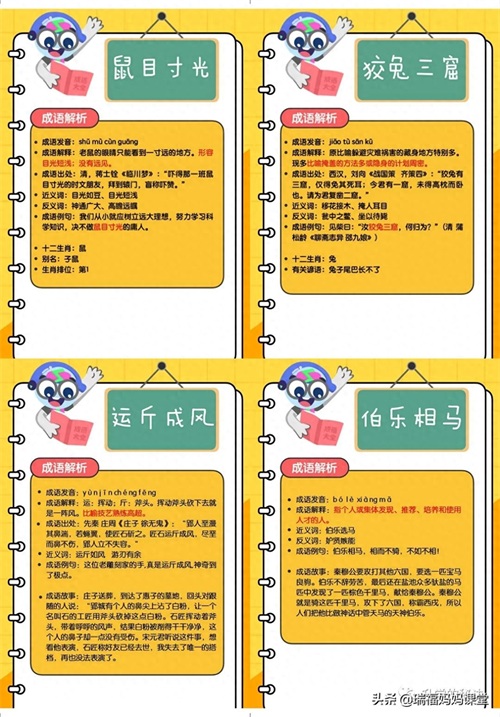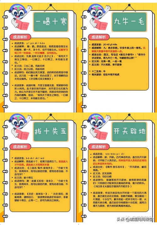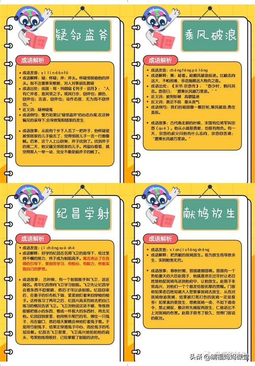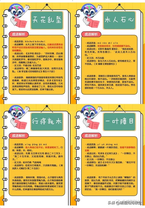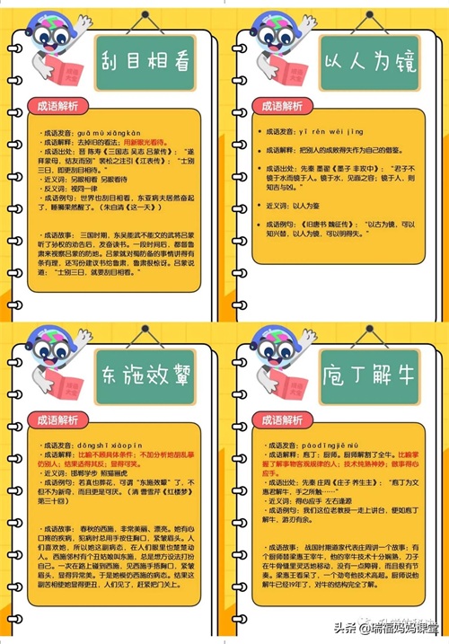 200个成语卡片和注释,还有解释、出处、近反义词和成语故事