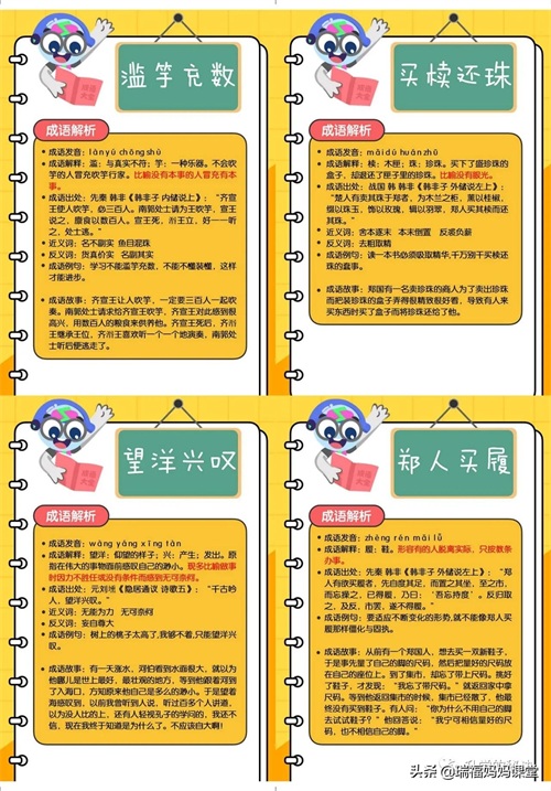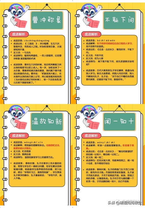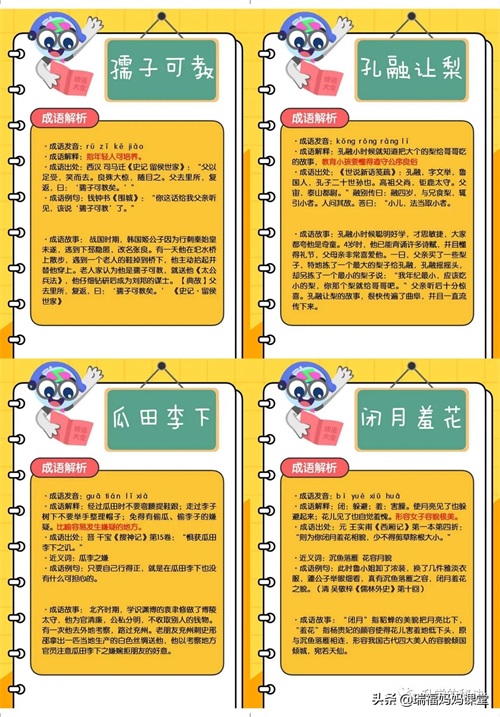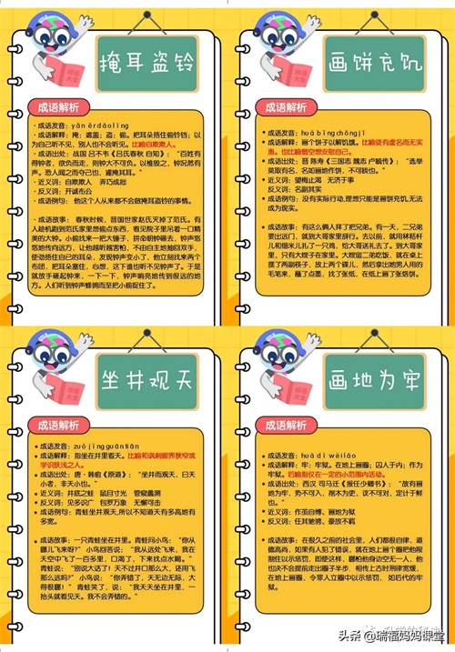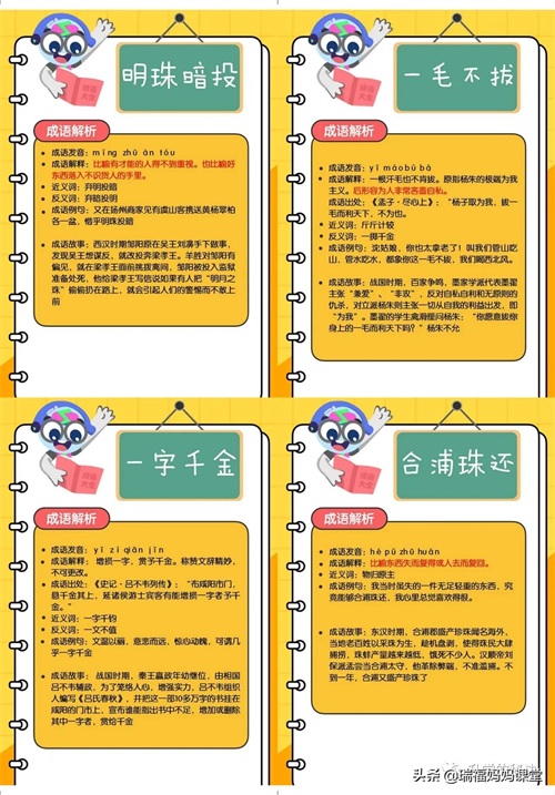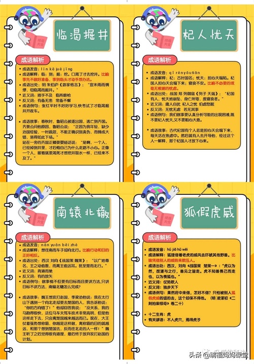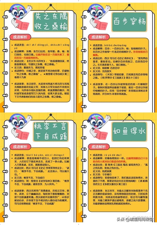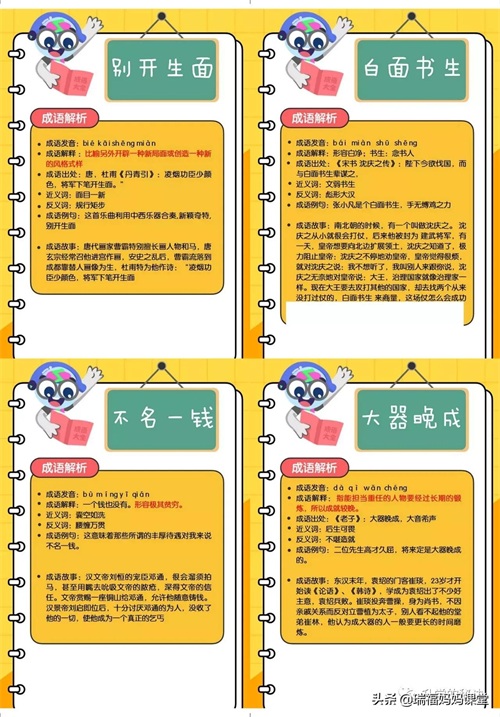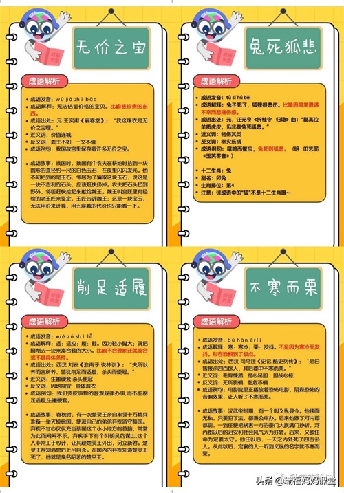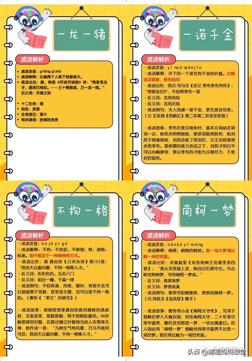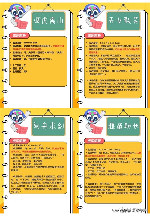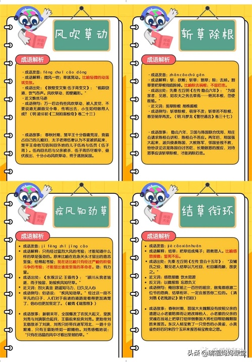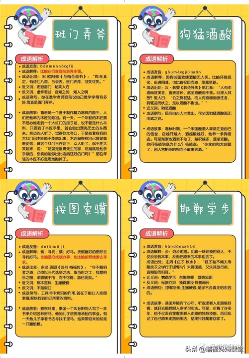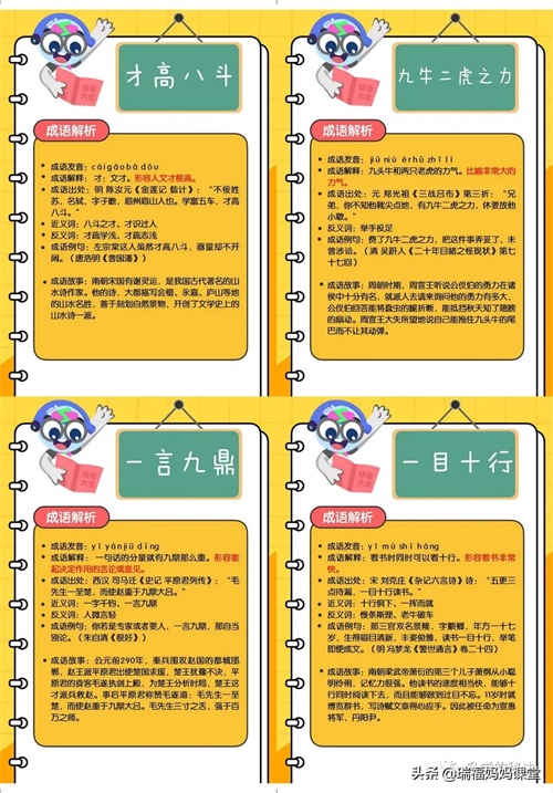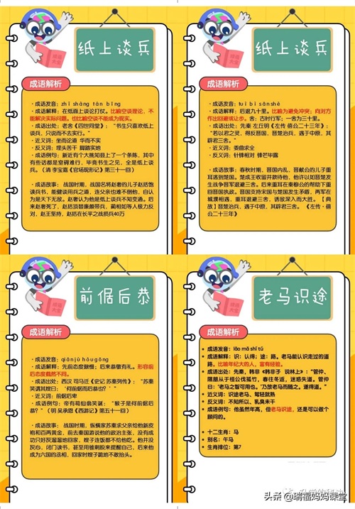 200个成语卡片和注释,还有解释、出处、近反义词和成语故事