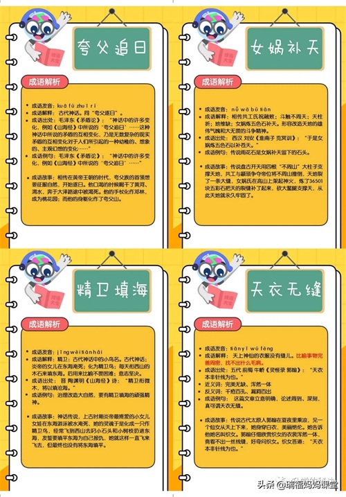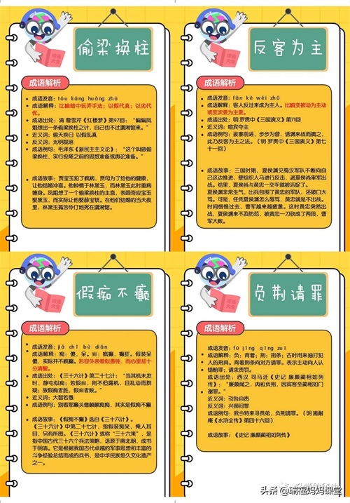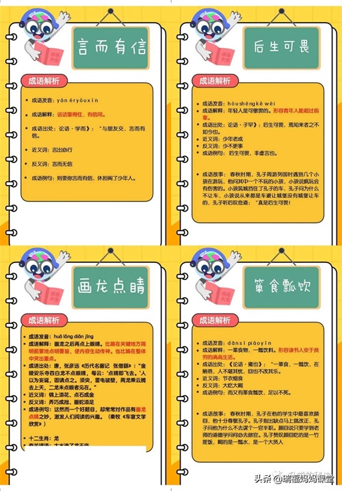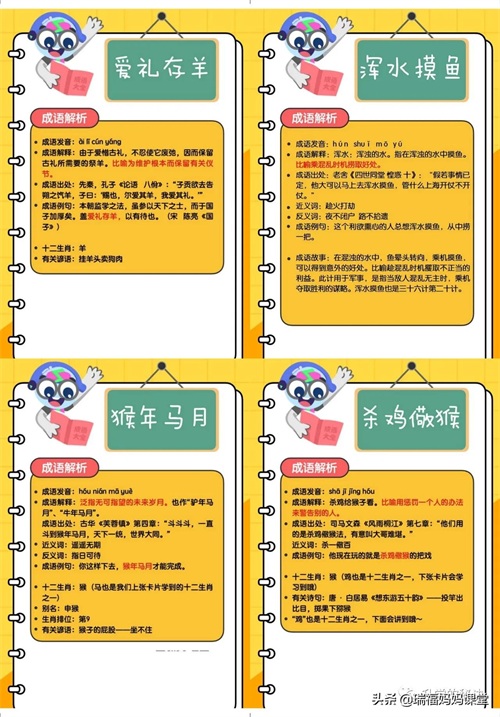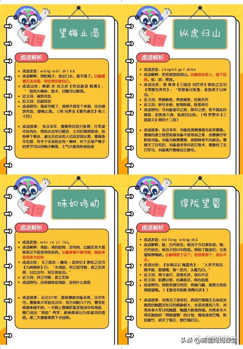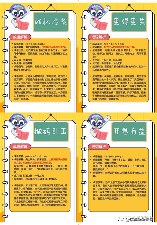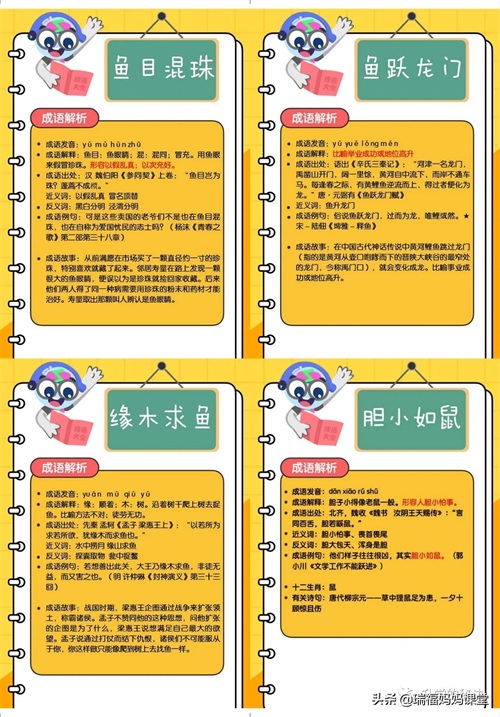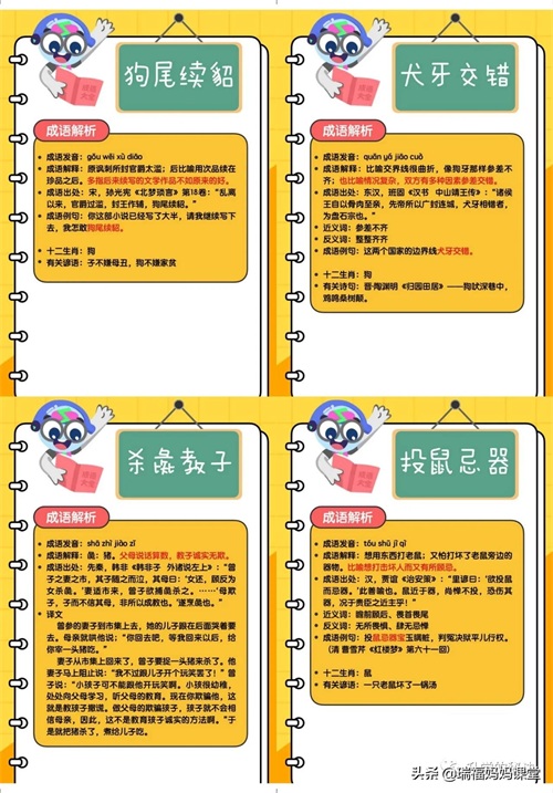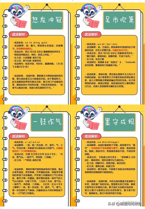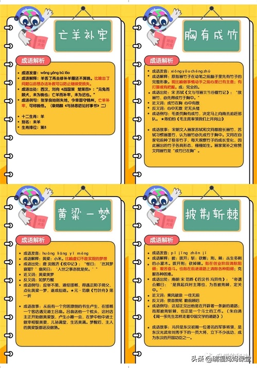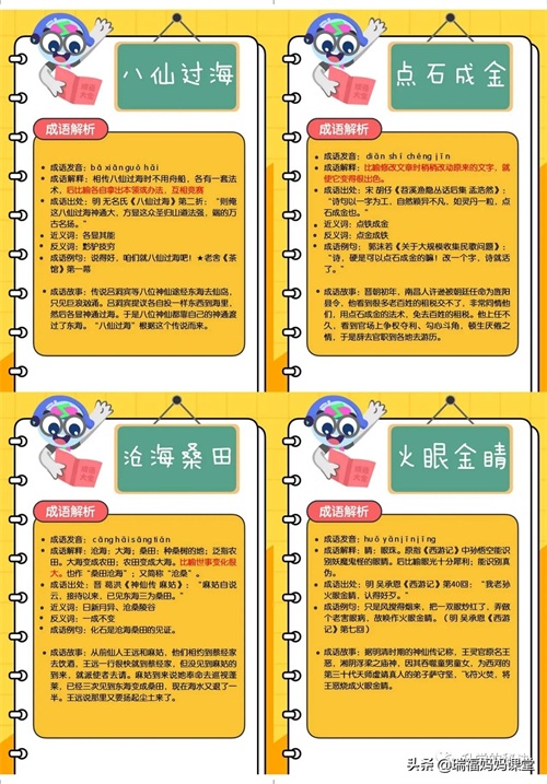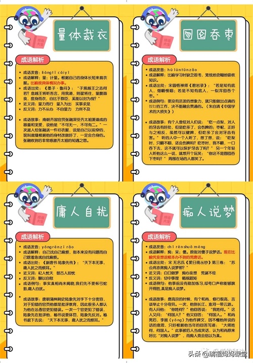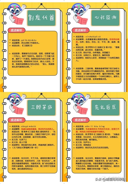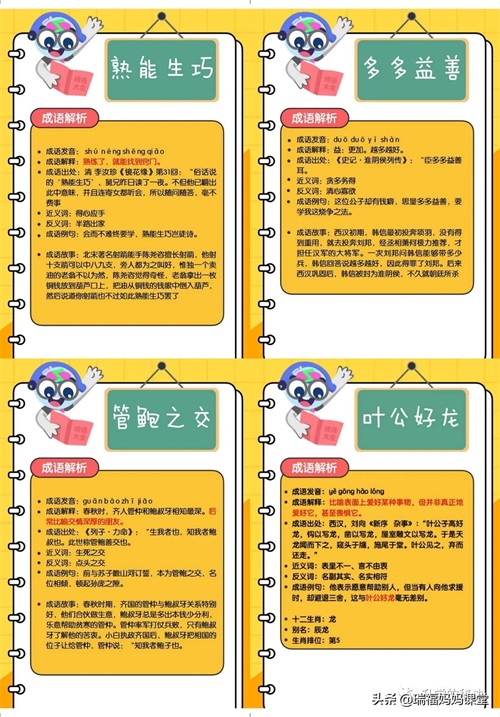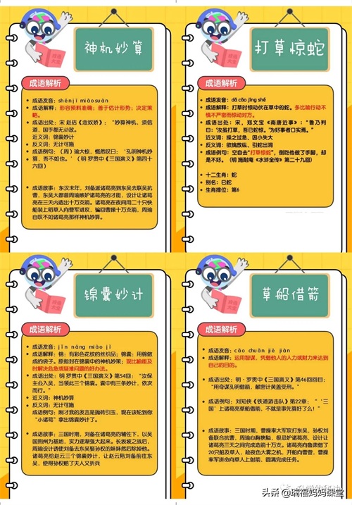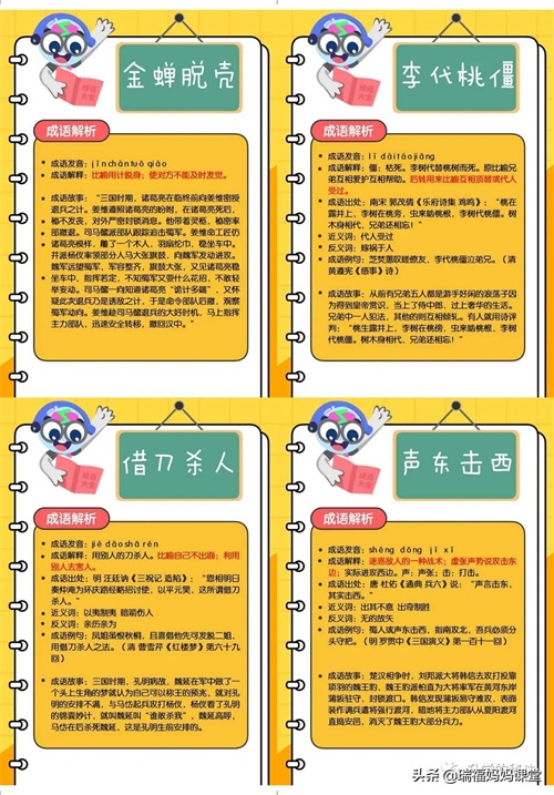 200个成语卡片和注释,还有解释、出处、近反义词和成语故事