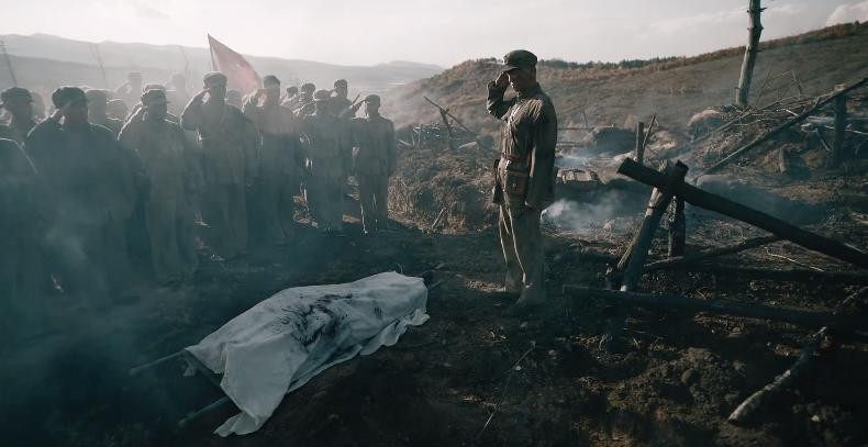 镜头转到战场上,光荣的志愿军不仅有“打仗就要有把握,没把握的仗不打”的战争智慧,还有“只解沙场为国死,何须马革裹尸还”的忠烈。