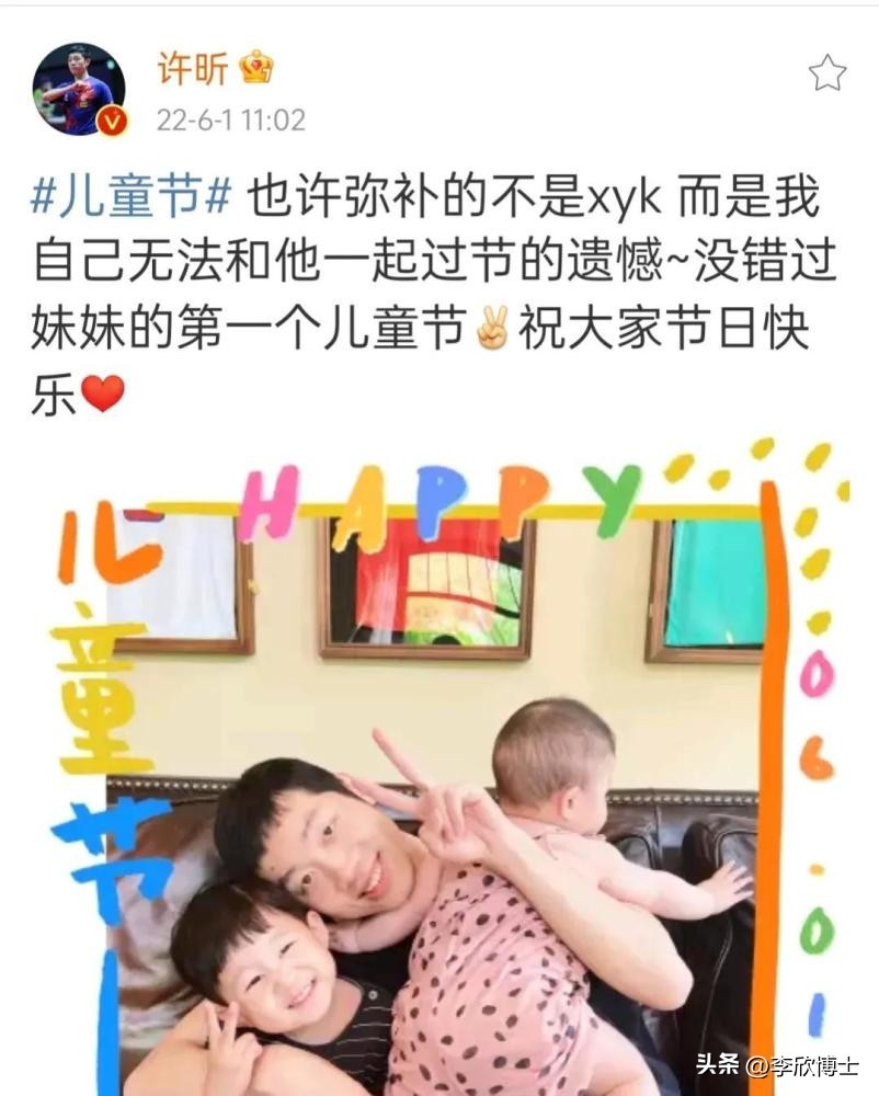 XYK是许昕儿子名字的缩写,前面两字各取许昕和妻子姚彦的姓,最后一个字许昕也没有透露过,但是球迷们都亲切的称他为“卡卡”、“卡宝”,从小就非常活泼可爱,圆圆的脑袋,圆圆的眼睛,很受球迷们的喜爱。