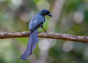 盘尾树鹊是一种全身漆黑的稀有鸟类,看起来和乌鸦非常像,但是仔细看就能发现它的全身都带有一种漂亮的金属光泽,呈现闪亮的铜绿色,尾巴极为硕大修长,眼睛也是非常深邃的蓝色,在国内仅仅只有云南低地地区有少量分布。