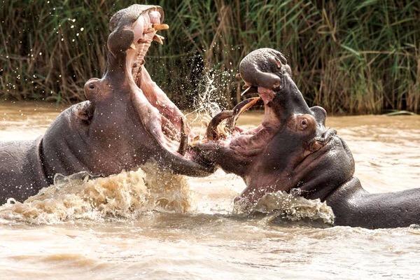 河马是食草动物,它们那宽大的嘴巴只用来吃植物,不过当雄性河马为了“爱情”相互竞争,或者当河马在鳄鱼和人类面前自卫的时候,它们会用尽全力下狠劲儿咬,咬合力可以达到826千克。再加上它们的嘴巴可以张开150度的大角,当它们张大嘴巴猛咬一口,威力十足。河马的嘴巴力大无穷,甚至可以把小船拖到水里弄沉。虽然它们看起来十分笨拙,但是短距离内的奔跑速度却可以达到30千米/小时。每年都有人因为闯进了它们的领地而被其咬死,所以,在野外一定要小心,远离相应的区域。