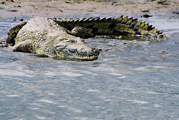 尼罗鳄,是非洲最大的鳄鱼。它们会捕食羚羊、斑马、水牛等动物,甚至可以猎杀河马、狮子,有时也会袭击人类。当可口的猎物靠近水源饮水的时候,尼罗鳄就会发动攻击,快速冲上岸,咬住猎物。它们的咬合力可以达到2268千克,牙齿坚韧锋利,能够穿透猎物的骨头,把猎物拽进水里,结束猎物的生命。