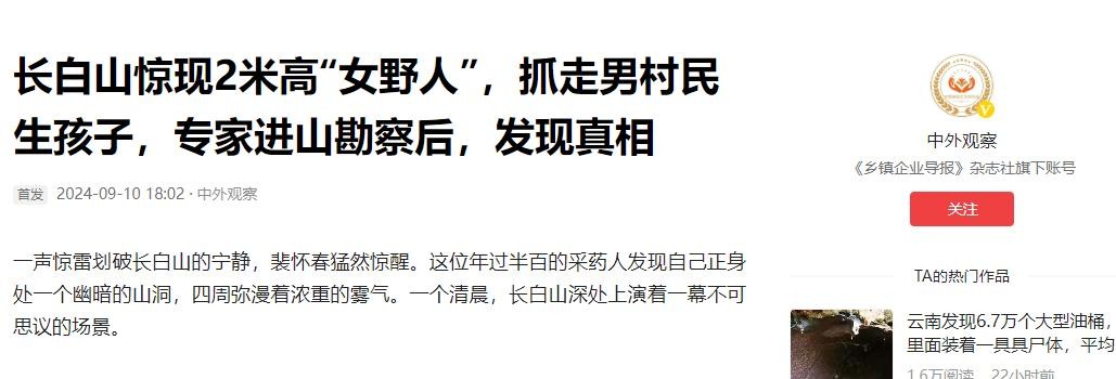 在遥远的东北边陲,长白山巍峨耸立,云雾缭绕之间,流传着无数古老而神秘的传说。其中一则令人瞠目结舌的消息如同山间的风,几十年来吹遍了这片土地——两米高的“女野人”现身,不仅惊扰了宁静的村落,更将一名男村民带入了前所未有的恐怖经历。