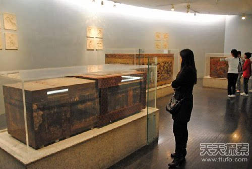 墓葬的椁室修建在墓坑底部。葬具之宏大,构造之搀杂令人瞠目。所有葬具托在三根垫木上头。外停的盖板和底板都是双层。从垫木底到外椁盖顶面的高度是2.8米,简直有一层楼房那么高。盖板上头平铺着26幅竹席。表层外椁盖由外框和盖板所构成。外框是用四根方木四角搭榫结合而成的,长6.73米,宽4.9米,厚0.4米。盖板是用五块木板横铺成的,嵌在方框内。