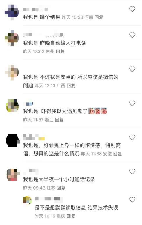 记者在社交平台上搜索后发现,从 6 月 6 日起,就有很多网友反映微信自动给别人打电话,在评论区更是议论纷纷,因为很多人都碰到了同样的情况。" 我也是,不过我是安卓的,所以应该是微信的问题 "、" 我也是大半夜一个小时通话记录 "、" 我也是,昨天自动给人打电话 "。