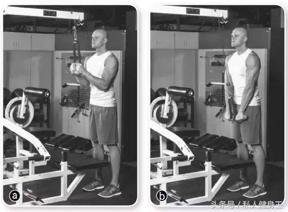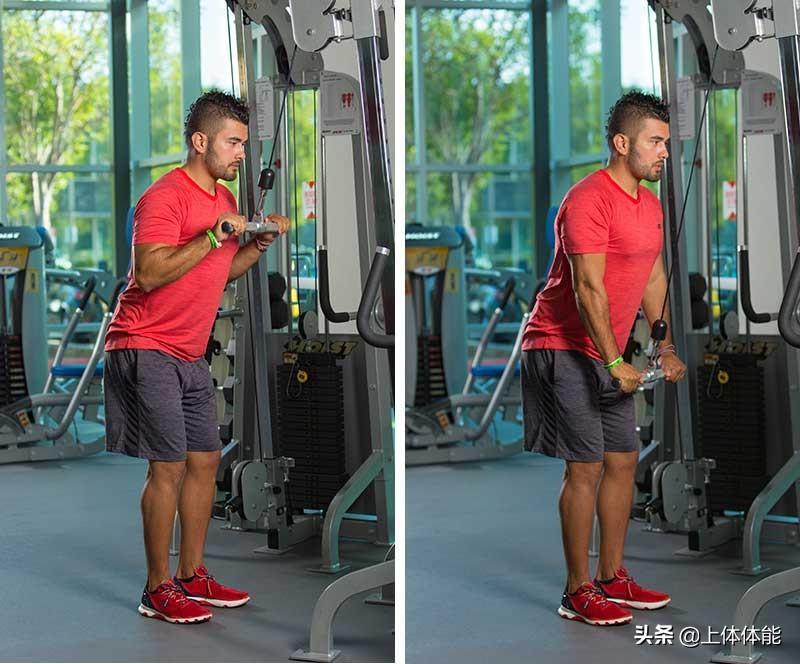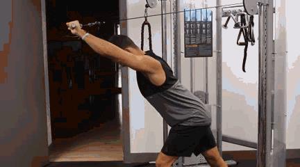 首先调整缆绳的高度和重量。双脚前后分开站立,从臀部稍微向前弯曲,这样你可以保持中立的脊柱。把绳子举过头顶,保持肘部弯曲。伸展肘部,在双臂伸展时分开绳子。回到原点,重复这个动作。
