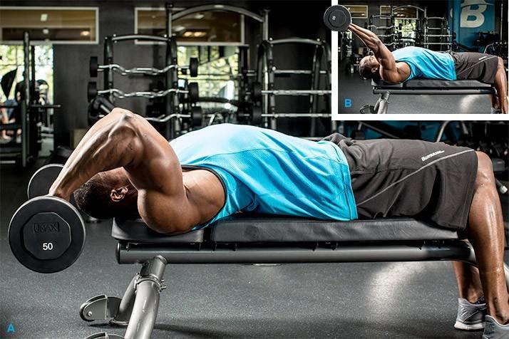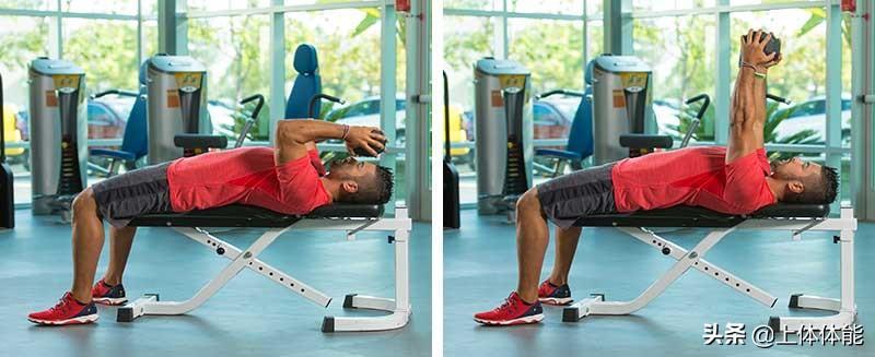 在这个练习中,你可以使用一个加重的哑铃或者一个加重的杠铃。躺在长凳上,把重量举过肩膀。将手向前额放下,肘部成90度角。将手臂伸展至起始位置。重复这个动作。