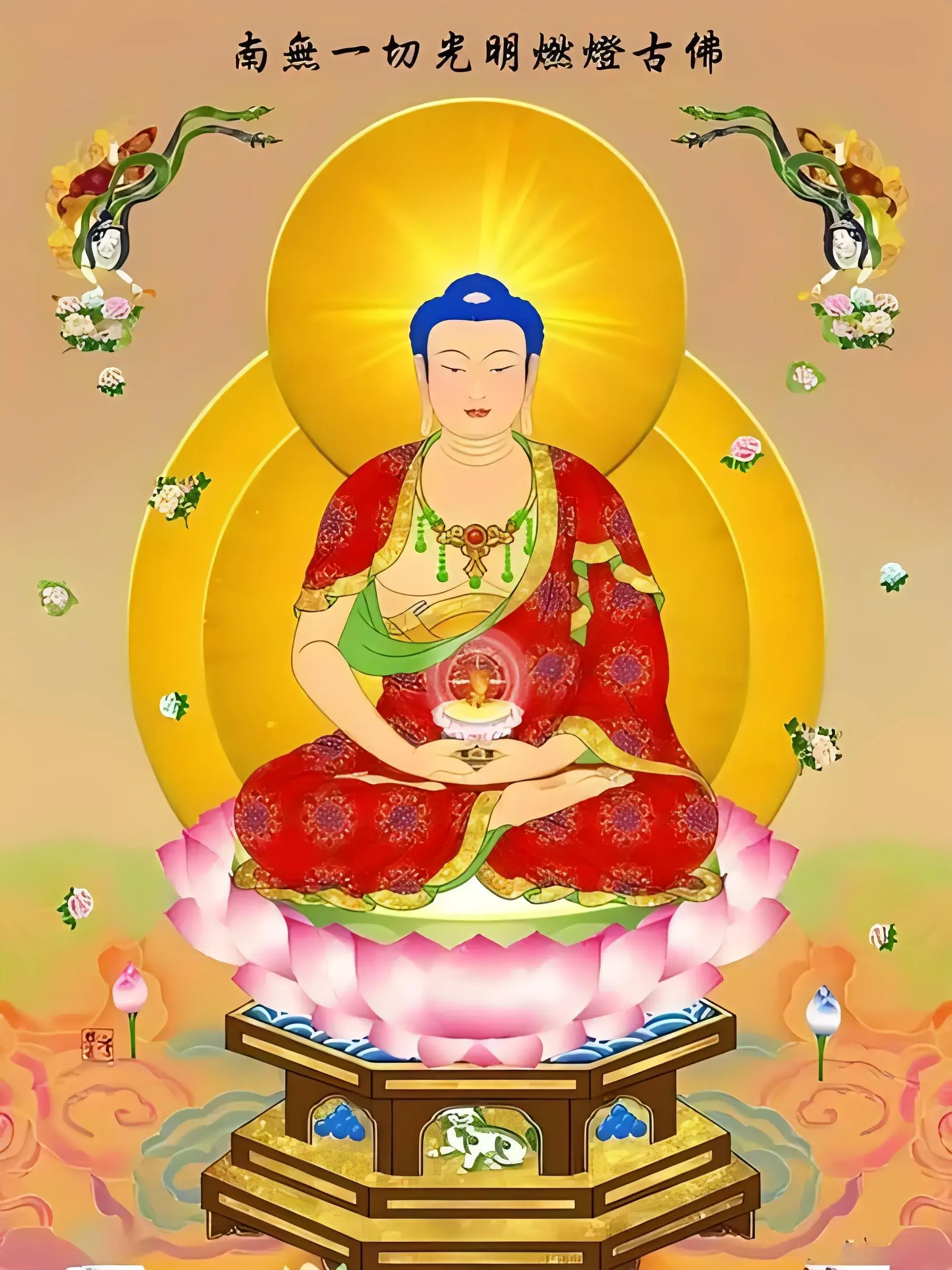 燃灯佛,佛教中纵三世佛之过去佛,为释迦牟尼佛之前的佛,地位尊贵。释迦牟尼佛主修今生,是现世佛。燃灯佛则修过去为过去佛。弥勒主修未来,为未来佛,为佛教三大教主之一。因其出生时身边一切光明如灯,故称为燃灯佛,又名“定光佛”或“锭光佛”。