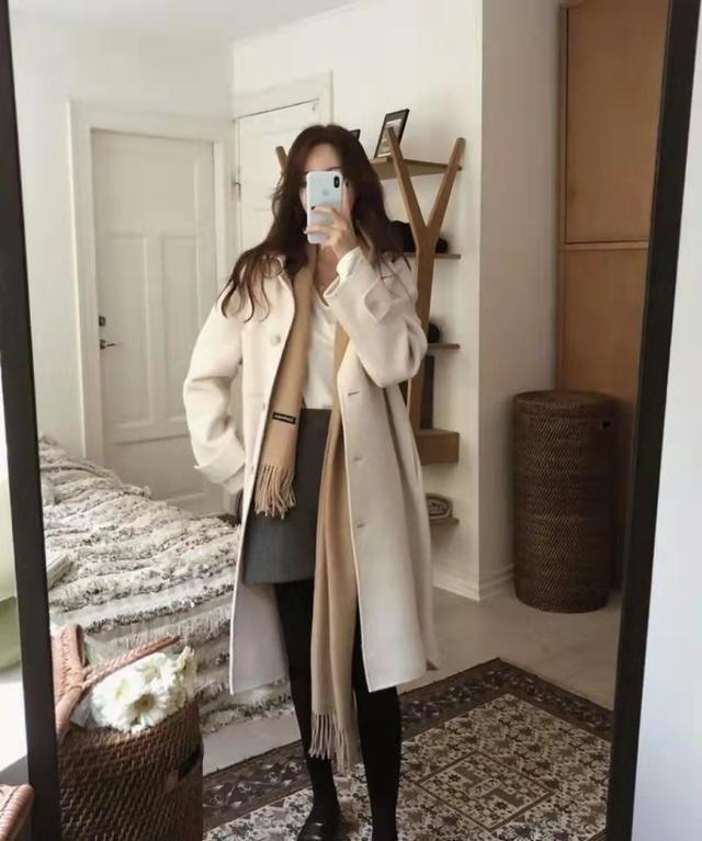 米白色大衣本身就是亮点,但是会显得宽松和臃肿,所以微胖的身材紧身搭配,注意修饰腿部,突出高级感。铅笔裤打底裤健身裤都是比较好的选择。