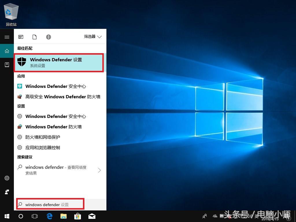 第一步:我们在小娜搜索中输入“windows defender”,然后点击打开“windows defender设置”程序。如图: