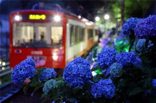 铁道沿线开满了紫阳花,蔚为景观,在电车上赏,会有误入乱花丛中之感,行驶于花海之中,浪漫无比。