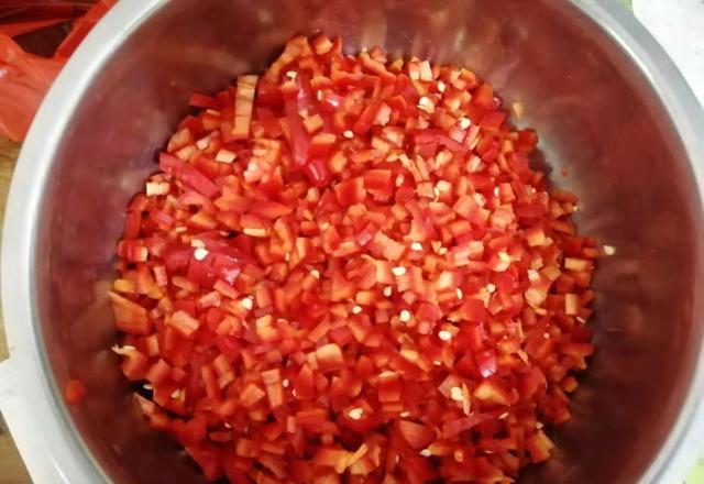 第二步:处理辣椒因为煮豆子的时间比较长,我们可以趁着这个时间把辣椒处理一下,首先把辣椒清洗干净,去掉辣椒蒂,空干水分。一定注意辣椒不能有一点坏的地方,否则一锅黄豆酱就完了。空干水分的辣椒可以用破壁机打碎,也可以用刀子切成小丁,建议用刀切,口感更好。