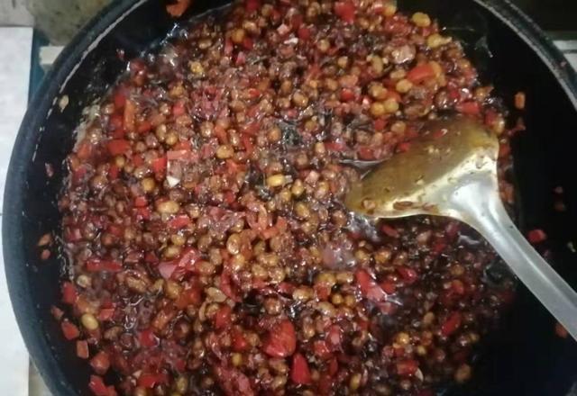 第三步:熬酱为了保证黄豆酱能够经久耐放,我们分几步来熬酱:1、锅里下油,油一定要多一些。油温3成热,将空干水分的黄豆下入油锅,炸大概15分钟,将黄豆里边的水分尽可能的炸出,这样黄豆吃起来更香,酱放的时间也更长。2、黄豆捞出来之后,直接原锅里的油,下入切好的辣椒丁,炒制8分钟左右,把辣椒中的水分也炸出来。