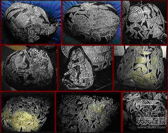 这些石头上蚀刻着许多图画,其中许多都是性爱场景,还有一些图画描述了人类做“心脏手术”和“大脑移植手术”的场面。然而最惊人的图画,却是人类捕猎恐龙的画面,这些恐龙包括三角恐龙、剑龙和翼龙。