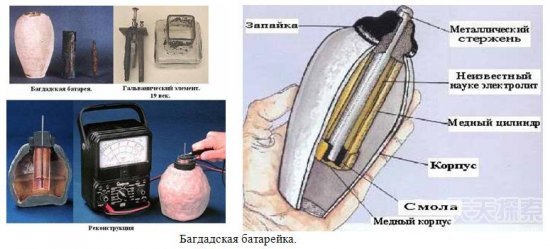 这种电池是在公元前248年到公元前226年的一个帕提亚村庄遗址上被发现的,它由5.5英寸高的粘土容器和一个铜柱、一个氧化铁杆组成。专家对它进行检测后断定,这种设备只要装满酸或碱性液体后,就可以产生电荷。