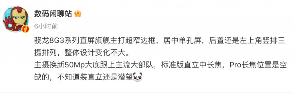 据数码闲聊站暗示,魅族 21 系列搭载骁龙 8 Gen3,主打超窄边框的直屏旗舰,居中单挖孔屏幕,后置还是左上角竖排三摄排列,整体设计变化不大。主要升级在于:1、主摄换新 50MP 大底跟上主流大部队的配置;2、标准版配备直立中长焦镜头,Pro 版长焦暂时不确定是直立还是潜望方案。换言之魅族 21 系列长焦是全系安排上了,具体方案还有待确认。