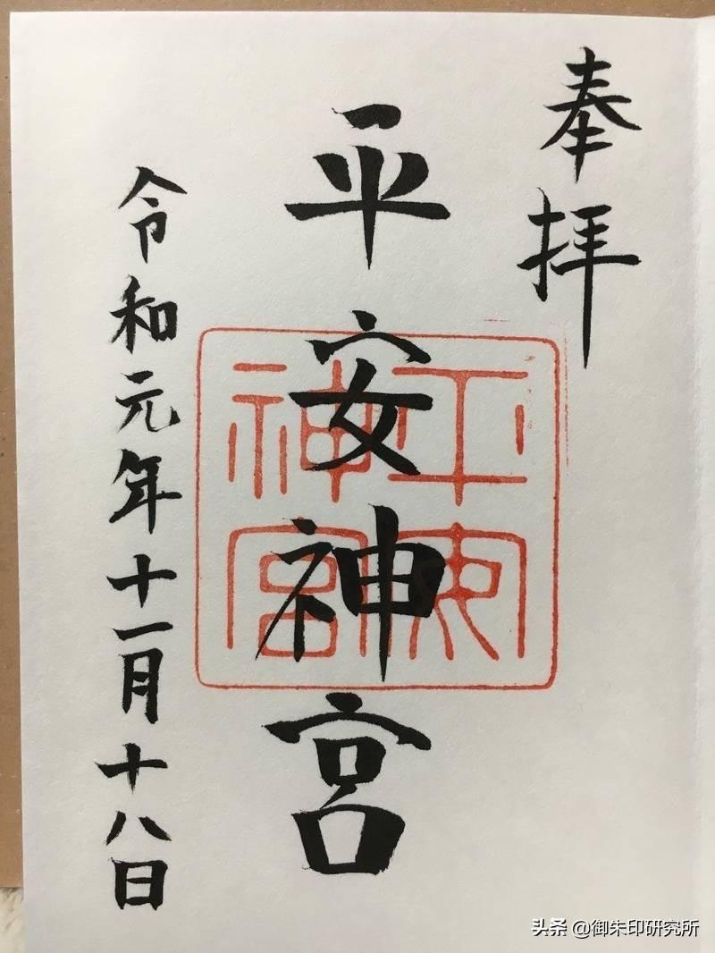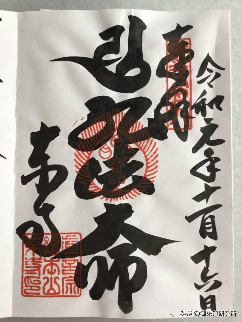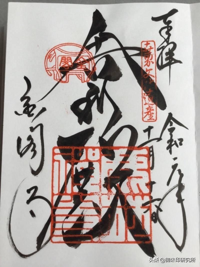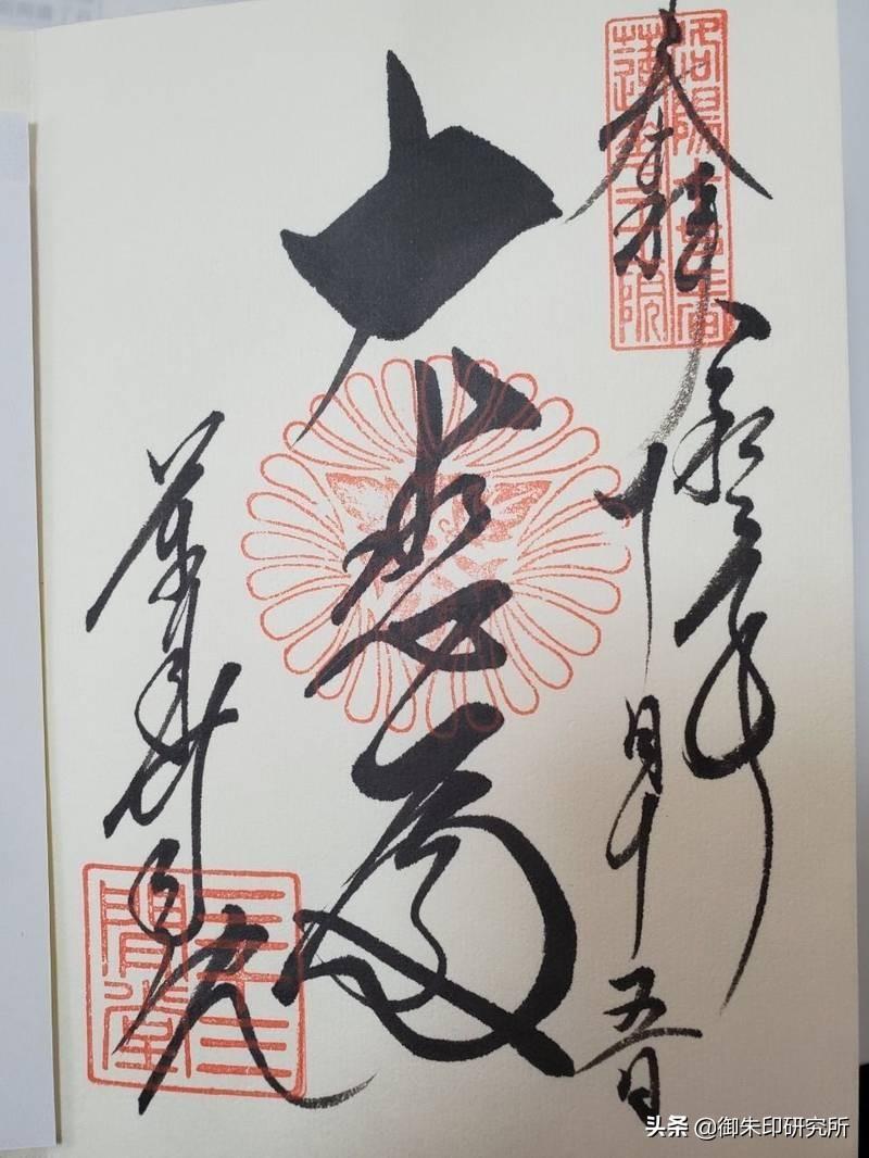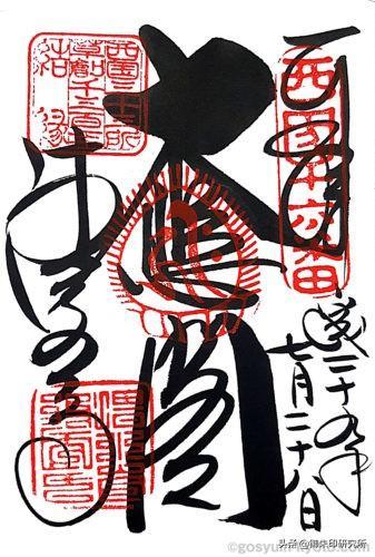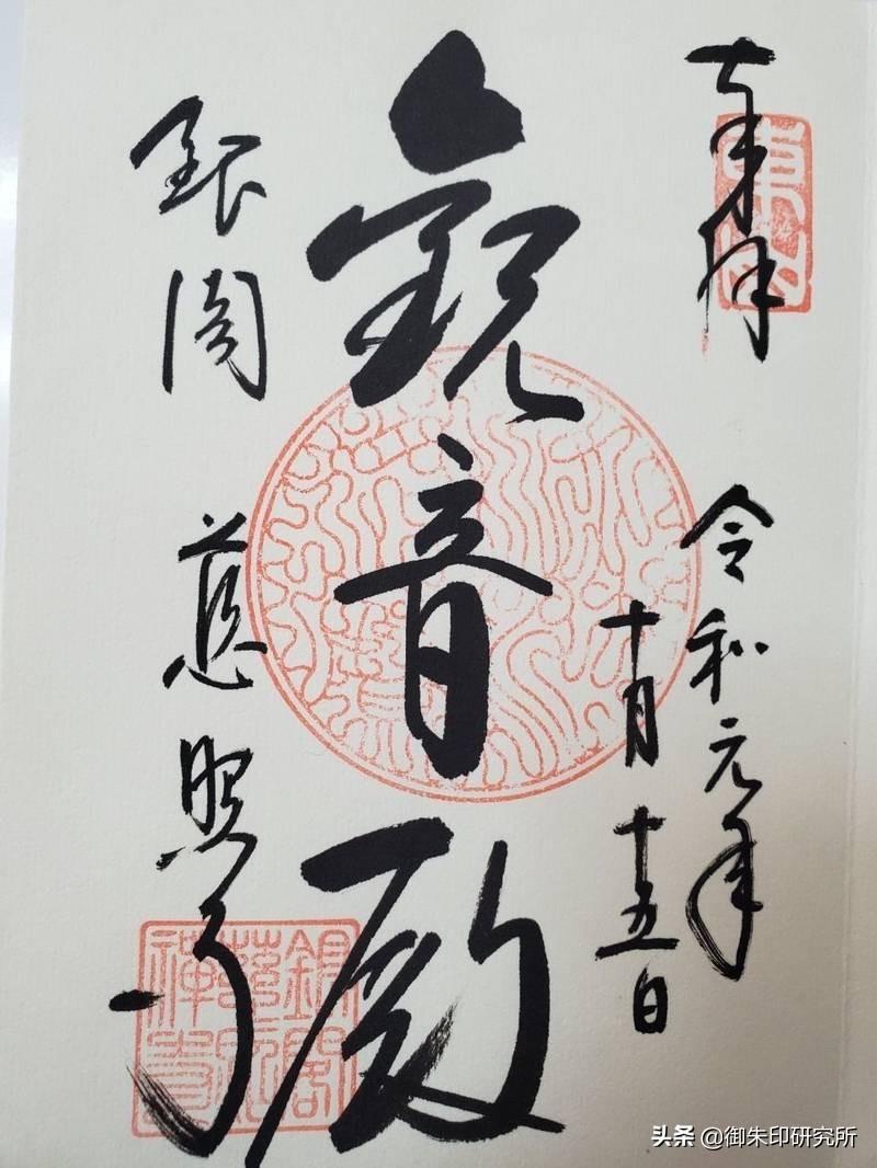 中间墨字“大悲阁”,朱印为圣观音梵字宝印,右上“西国十六番”印表明清水寺是“西国三十三观音灵场”巡礼第十六番,左上为“西国三十三所草创一千三百年结缘”纪念印,现在去领受都有,左下方墨书“清水寺”,朱印为“清水寺经堂印”。清水寺的这枚标准御朱印就是一枚巡礼用御朱印。