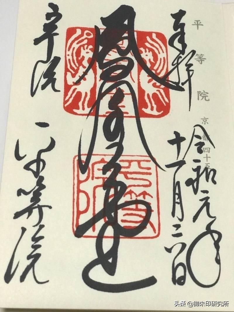 中间墨书“凤凰堂”,下方为凤凰堂印,及“平等院”篆字印,左方墨字为“宇治 平等院”。