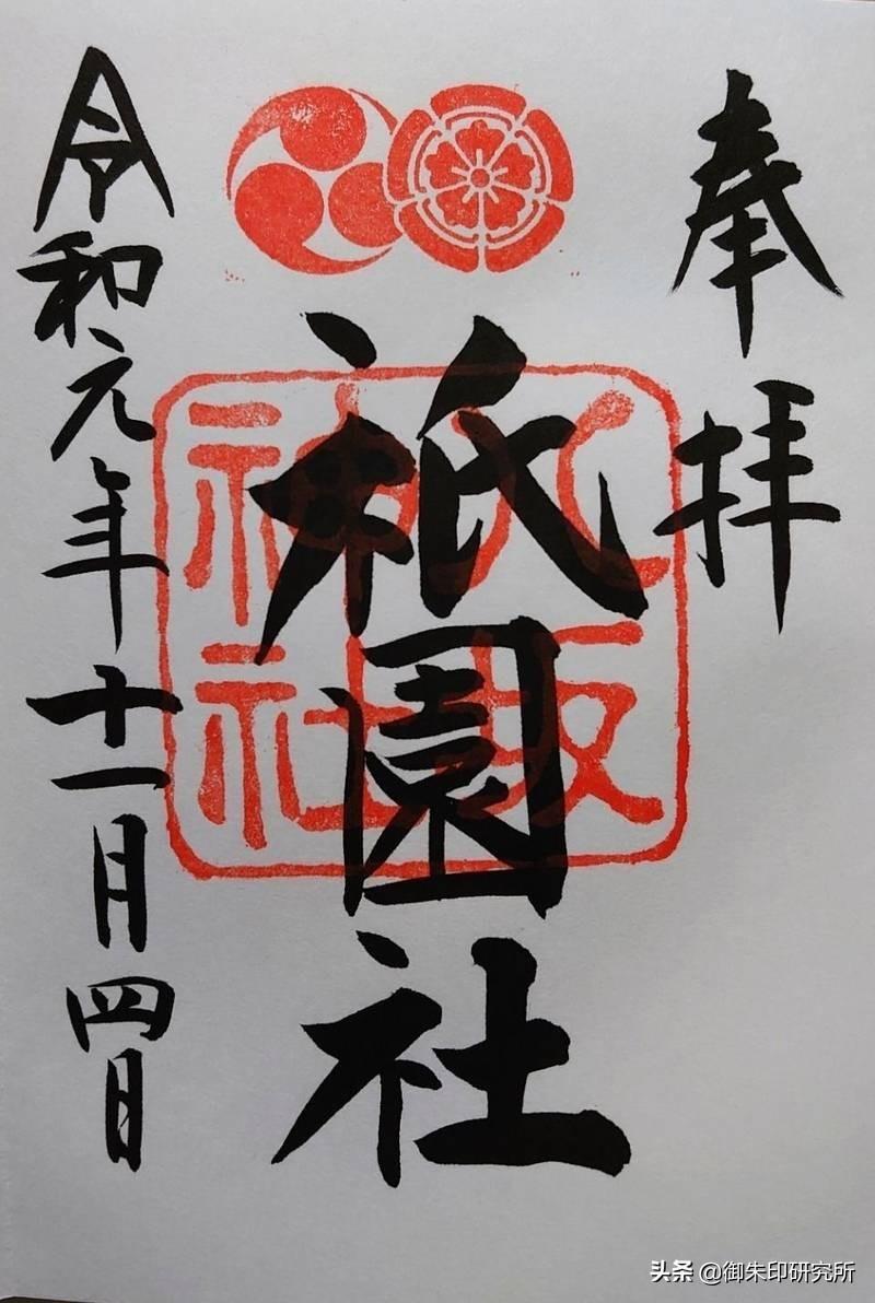 上方朱印为“左三巴纹”和“木瓜纹”,分别是八幡神和牛头天王的神纹。中间朱印为“八坂神社”。中间墨书为“祗园社”。