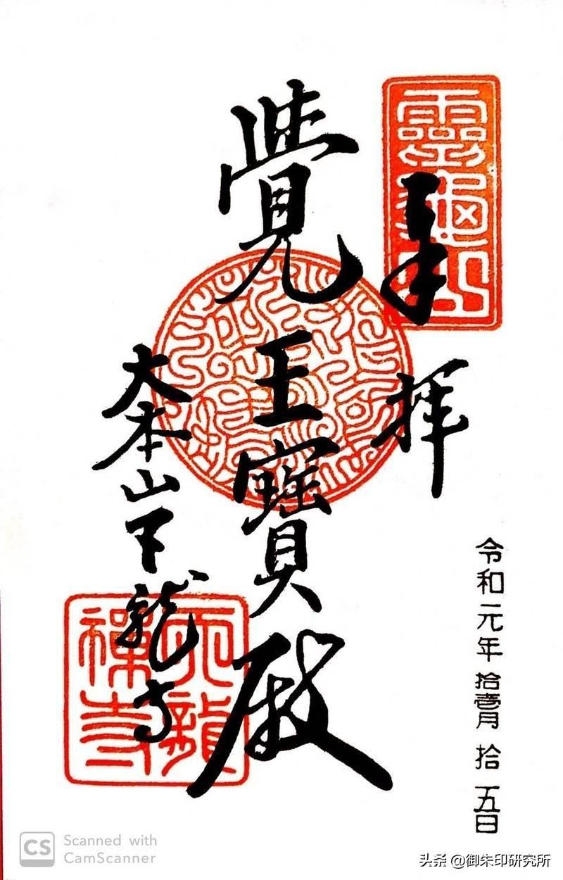 中间墨书“觉王宝殿”,下为佛法僧三宝印。右上为山号印“灵龟山”,左下为寺名印“天龙禅寺”。