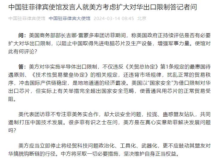 中国驻菲律宾使馆发言人就美方考虑扩大对华出口限制答记者问