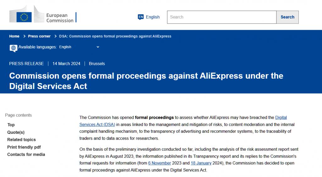 欧盟委员会对阿里速卖通启动正式调查,评估其是否违反数字服务法