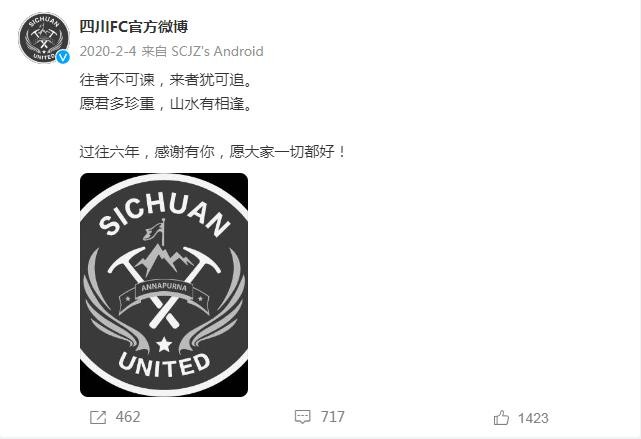 2020年2月4日,四川FC微博官宣解散,微博写到:往者不可谏,来者犹可追,愿君多珍重,山水有相逢,过往六年,感谢有你,愿大家一切都好。