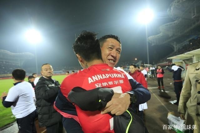 川足名宿黎兵在2018赛季冲甲战后和球员拥抱庆祝