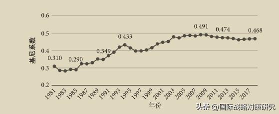 变量估计表明,中国城市和农村的收入不平等已经明显增加。中国的基尼系数在1988年为0.382,1995年为0.437,2002年为0.454,并在2008-2009年左右达到了0.49的峰值,后在2015年下降到0.42。基于可比数据集的估计表明,中国城市的基尼系数从1978年的0.16上升到2000年代中期的0.34,然后自2010年以来略有下降,中国农村的基尼系数从1978年的0.22上升到2009年的0.39,然后在2011年略有下降。此外,城市和农村家庭的收入差距在过去几十年中呈现出上升趋势,在2000年代末左右达到了3.3倍的峰值(城乡比),然后在2010年代下降到接近3。上述数字表明,整个国家的基尼系数高于农村和城市地区的基尼系数,这是因为中国城乡之间的收入差距非常大。换句话说,与其他