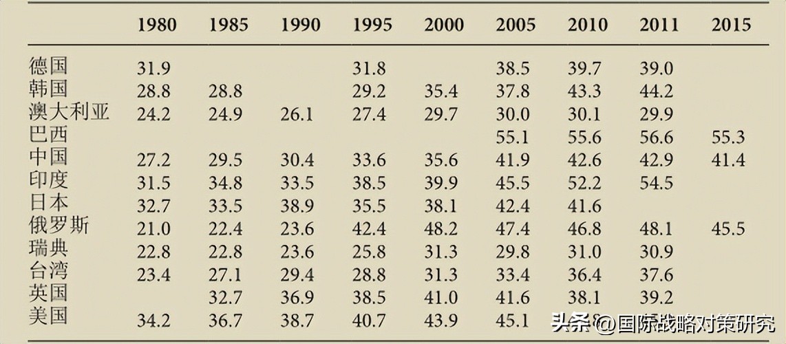 大部分私人资产也是以家庭储蓄的形式出现,从人均计算来看,数额很小。直到1990年代,财富分配的不平等甚至比收入不平等还要低。例如,1995年收入不平等的基尼系数是0.45,而财富不平等的基尼系数是0.40。然而,自20世纪90年代中期以来,财富分配的不平等迅速增加。2002年,中国整体财富分配的基尼系数上升到 0.55。此外,由于收入不平等的上升和城市地区房价的快速上涨,财富分配的不平等在2010年代迅速上升。财富分配的基尼系数在2010年达到0.68。在收入不平等方面,将中国与一些已经顺利成为高收入经济体的亚洲经济体进行比较也是很有意思的。韩国和台湾是比较的好例子。 表9.4 税前国民收入中最富有的前10%所占份额(%)