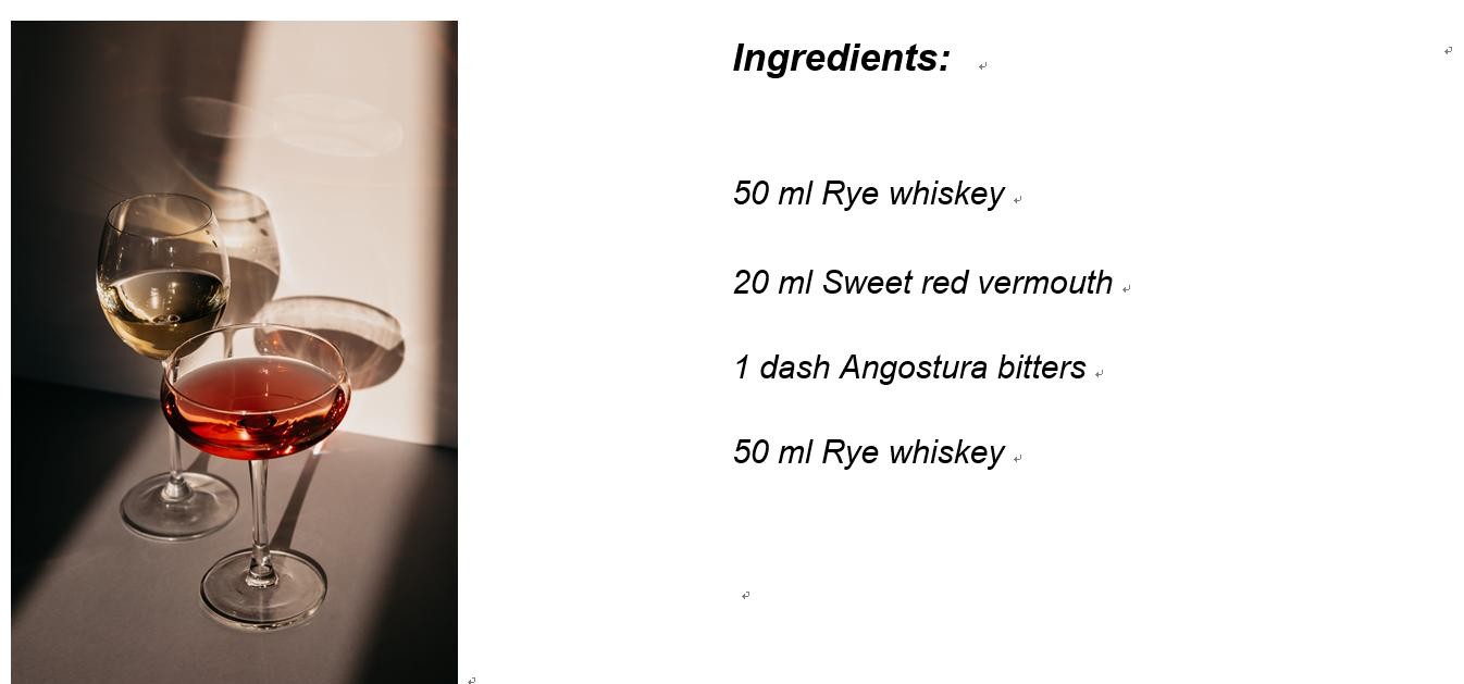 Manhattan(曼哈顿)的起源可以追溯到19世纪80年代,最初是由威士忌、甜苦艾酒和红樱桃制作而成。配方有很多种,其中一种常见的配方是威士忌、甜苦艾酒、苦精和红樱桃装饰。另一种配方是使用波本代替威士忌,甜苦艾酒和安格斯特拉苦酒的比例也稍有不同。Manhattan口感强烈而直接,同时具有甜味和苦味,加上红樱桃的酸甜味道,口感酸甜可口。Manhattan因有了苦艾酒,味道稍微有点葡萄酒味,而且相对苦涩,它通常被认为是一种充满魅力和优雅的饮品,适合在庆祝活动或正式场合享用。