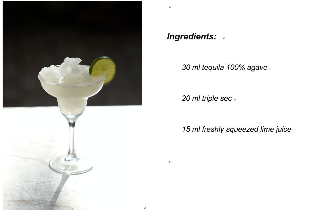 玛格丽塔在西班牙语中意为“Daisy(雏菊)”,是玛格丽特的昵称。Margarita配方有多种,其中一种常见的配方是:龙舌兰酒、君度力娇酒、鲜柠檬汁、盐、冰块。它是一种适合夏天饮用的鸡尾酒,柠檬汁的酸味与triple sec的甜味相平衡,而盐边则为此添加了恰到好处的咸味。无论你是喜欢 frozen or on the rocks,有没有盐边,或者是否添加草莓、芒果等水果风味,它的口味可以变化无穷。即使对于那些不爱酒精的人,也有适合他们的无酒精玛格丽特。