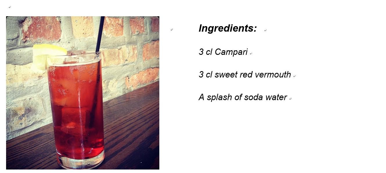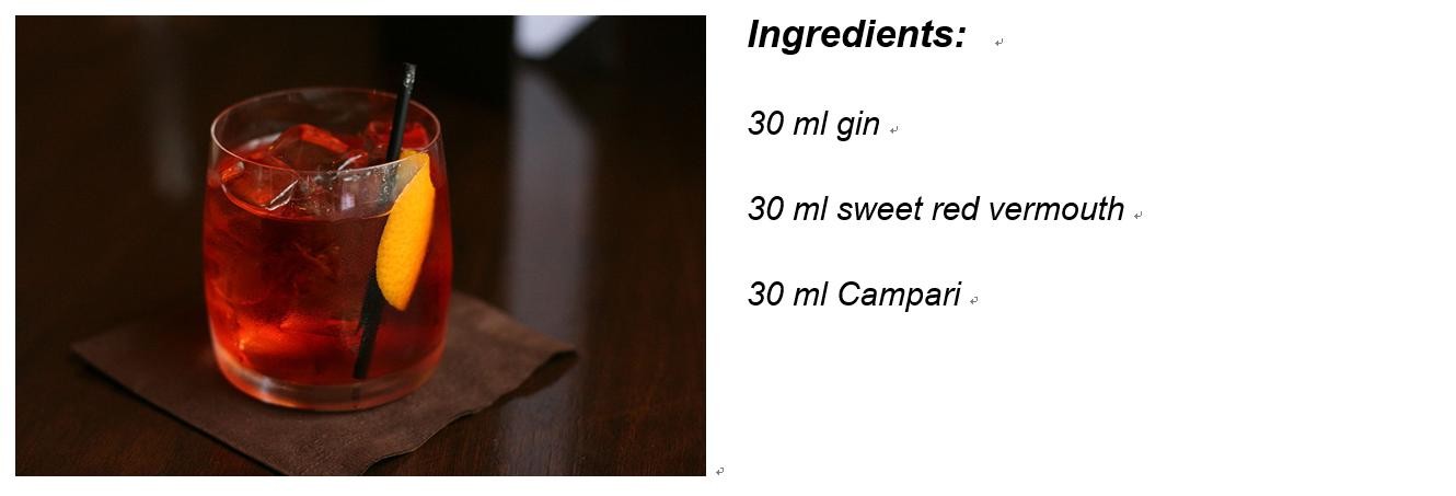 Americano最初被称为Milano-Torino,是用基酒的名称得名, Gaspare Campari作为发明人。此鸡尾酒配料包括包括gin、sweet red vermouth、柠檬汁(可选)和苏打水。这款鸡尾酒的口感酸甜适中,带有浓郁的水果香气和微苦的味道。在19世纪末或20世纪初,当时在意大利的酒吧中,美国客人经常点这款鸡尾酒,因此得名Americano。作为IBA官方鸡尾酒之一(International Bartenders Association.),Campari(金巴利)赋予这款鸡尾酒苦涩及淡淡的柑橘味,并带着细腻的香料气息。Campari可以说是红苦类中最著名的利口酒,她有着标志性的风味和颜色,传统是通过加入胭脂虫(一种由昆虫产生的红色染料)来获得鲜艳的颜色。