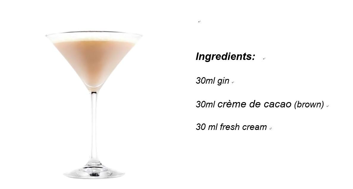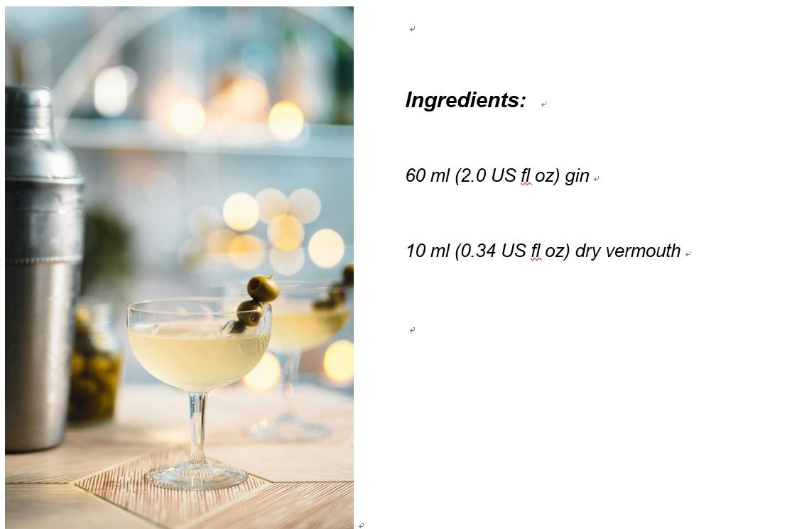 Martini起源可以追溯到19世纪末的意大利,最初是由杜松子酒、苦艾酒和橙味苦艾酒调配而成。它配方有多种,其中一种常见的配方是干味金酒和干味苦艾酒,加入冰块摇匀后过滤到马天尼杯中,再用橄榄进行装饰。另一种改良的配方是用伏特加代替杜松子酒,再加入干味苦艾酒、甜味苦艾酒和橙味苦艾酒,同样加入冰块摇匀后过滤到马天尼杯中,再用橙片进行装饰。提到martini,就不得不提到他的另一种形式 dry martini。他是用很少甚至不加苦艾酒调制的。从最初2:1的比例,逐渐下降到3:1,4:1,甚至在20世纪后半叶,5:1或者6:1的dry martini被认为是常态。Dry Martini 因为使用了更干的酒,使得口感更加清爽、干冽,几乎没有甜味,具有浓郁金酒的烈性,而传统的martini则会使用甜味的杜松子酒和苦艾酒,因此口感上更加甜润。