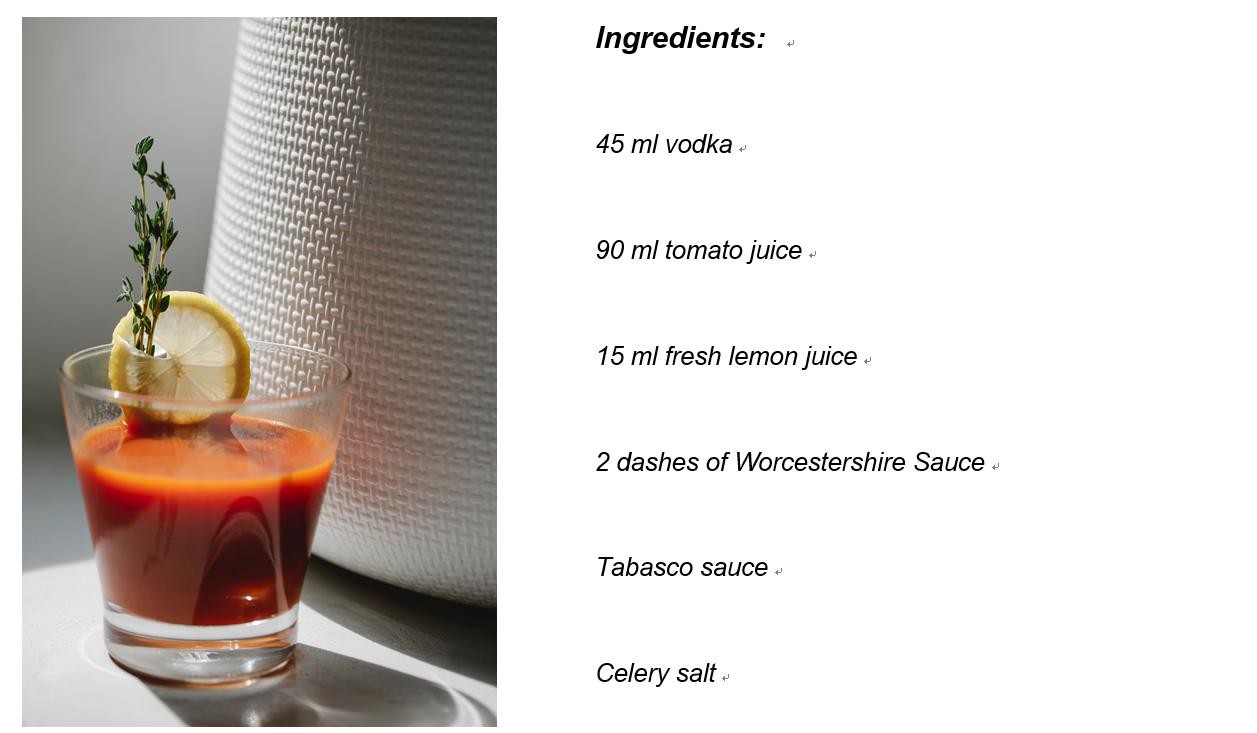 Bloody Mary起源可以追溯到20世纪20年代的巴黎哈里纽约酒吧,由一位名叫费尔南德的调酒师发明,最初因为此酒是混有伏特加和番茄汁,所以被称为“一桶血”。她的配方有多种,其中一种常见的配方是伏特加、柠檬汁、鲜磨的胡椒粒、盐、Tabasco少司、伍斯特少司、1番茄汁。另一种配方是白兰地、甜味美思、干威未酒(又叫干味美思)。Bloody Mary口感丰富,甜、酸、苦、辣四味俱全,富有刺激性,洋溢着一种番茄汁的香味,但入口时因为其中的伏特加,使口感极其顺滑,还有微辣,在舌尖和牙齿间颤抖,非常缠绵悱恻。