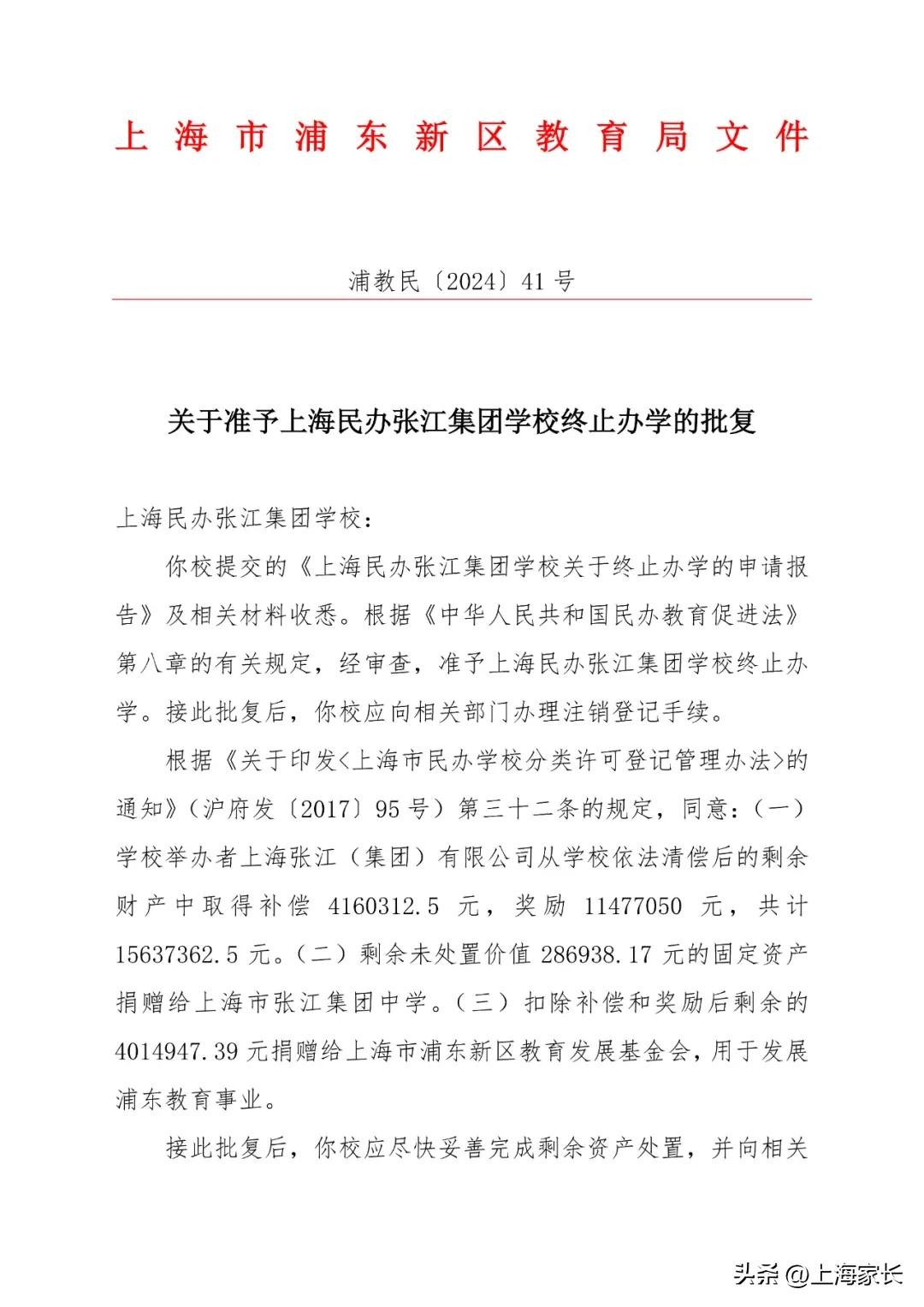 7月31日,浦东新区教育局发布一则消息《关于准予上海民办张江集团学校终止办学的批复》。