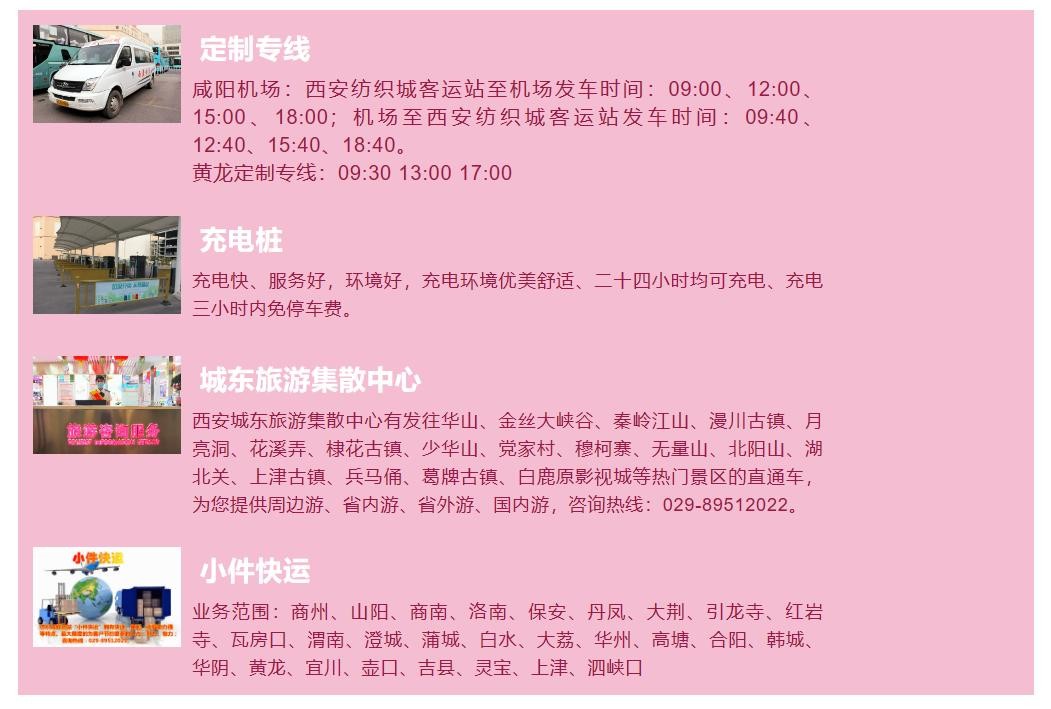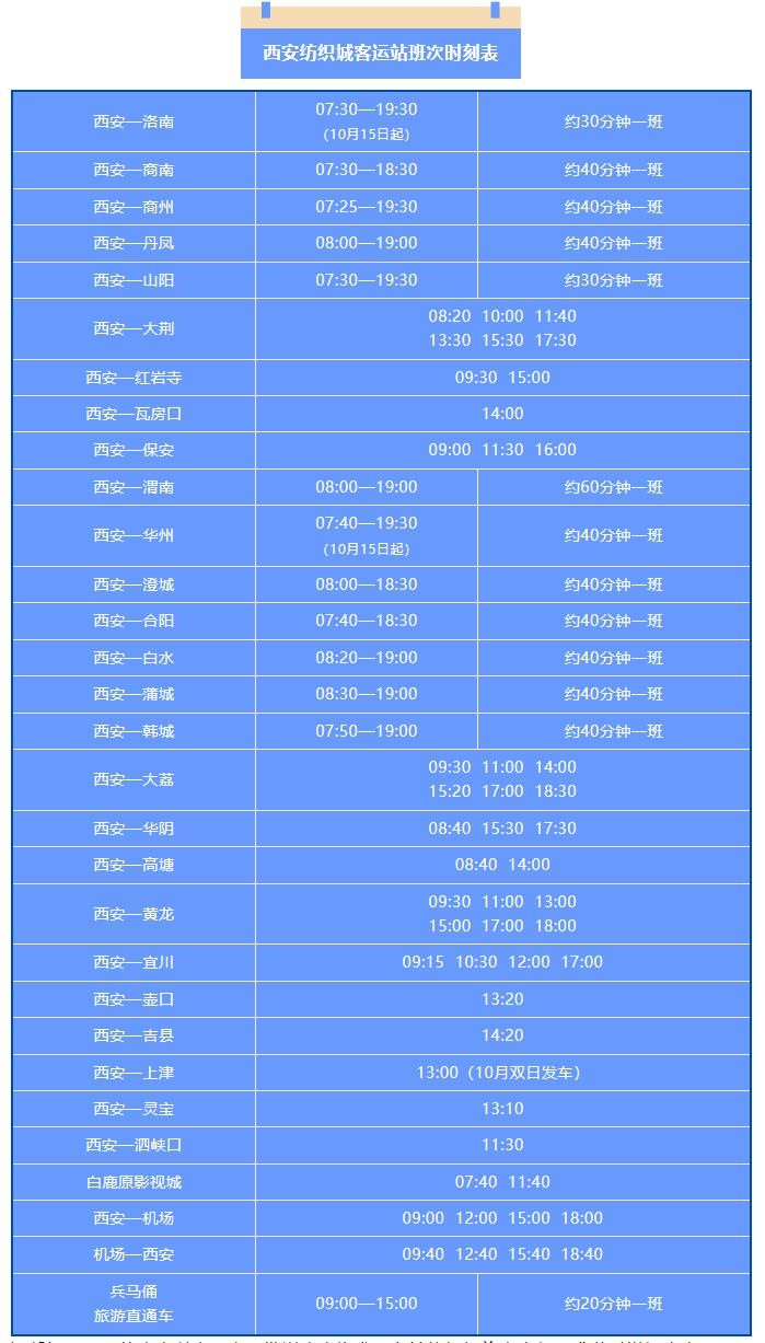 根据季节客流变化情况,即日起,西安纺织城客运站营运班线执行冬季运行时间,洛南、韩城、澄城、合阳、华州线路发车时间均有调整。敬请广大旅客密切关注班线冬季运行时间并相互告知,可关注“纺织城客运站”微信公众号、新浪微博、今日头条了解更多班线信息,提前规划好出行时间,确保出行顺畅。