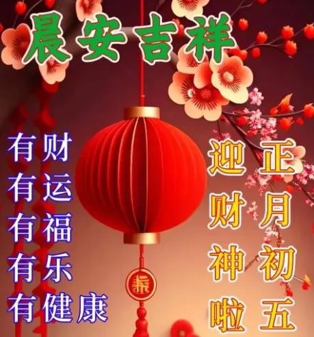 2. 初五清晨阳光灿,正月接财早上好。盼你金银抱满怀,吉祥常围绕,新的一天充满希望与喜悦。